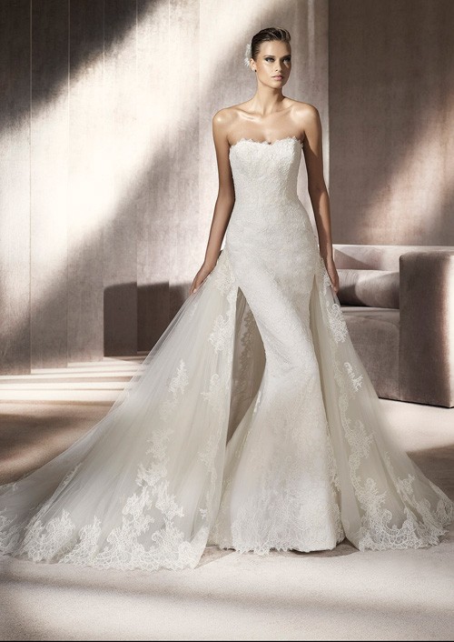 pluma Published August 9, 2015 at 500 × 706 Pronovias Pluma sz12 Lace and tulle strapless fitted gown with a sweetheart neckline and a detailed train.
