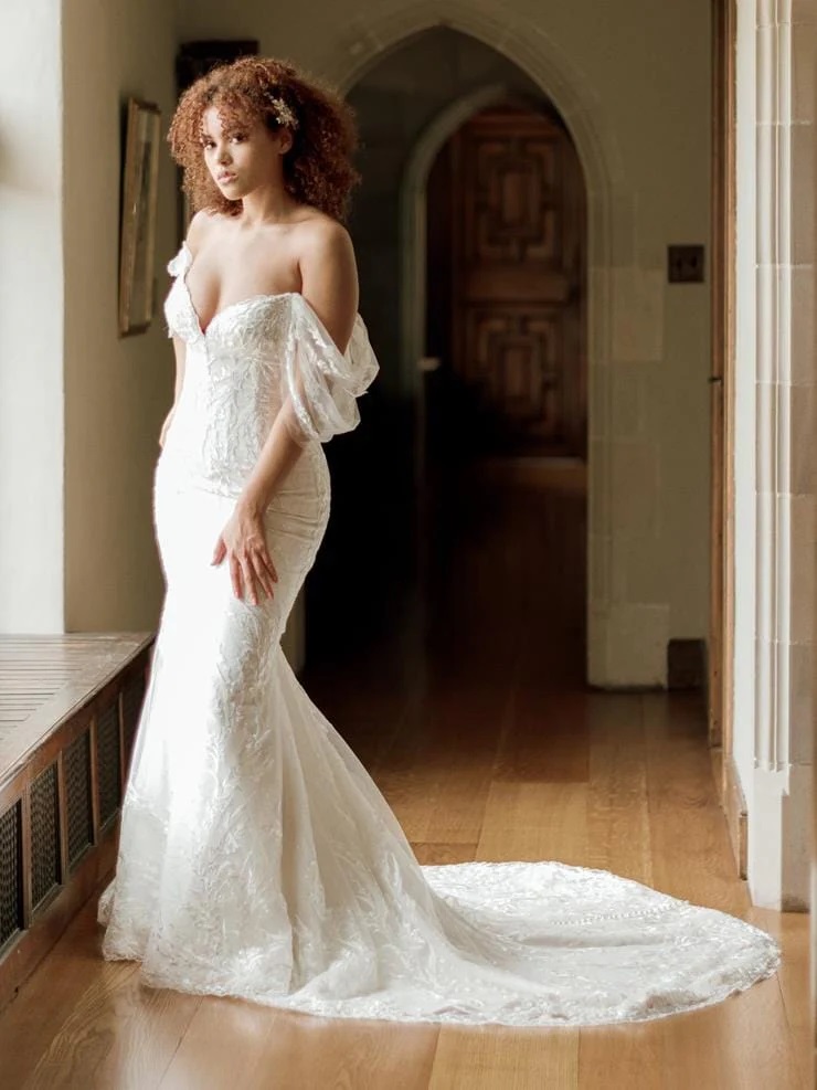 Salma Published February 16, 2025 at 740 × 987 VanderVelde Salma sz12 Lace fit and flare gown featuring a unique V back. The strapless bodice has airy off the shoulder straps. The silhouette is finished with a chapel-length train. Pearl buttons down the back…