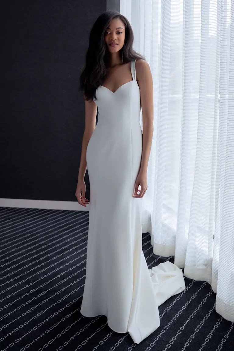 Samantha Published December 19, 2024 at 768 × 1152 Jenny Yoo Samantha sz10 Crepe fit and flare dress is as classic as she is modern. Chic square sweetheart neckline and tapered straps. Princess seams sculpt for a flattering fit. Low scoop back and covered buttons to the cathedral train