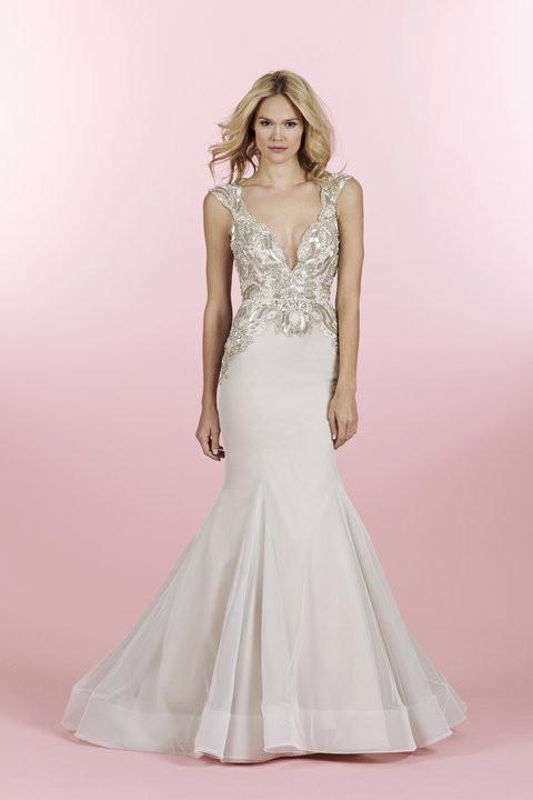 sasha Published December 12, 2020 at 480 × 720 Hayley Paige Sasha sz20 Moonstone tulle fit to flare gown, stunning allover encrusted bodice with geometric beaded detail through the hip, deep V-neck with cap sleeve and open back with crystal belt detail.