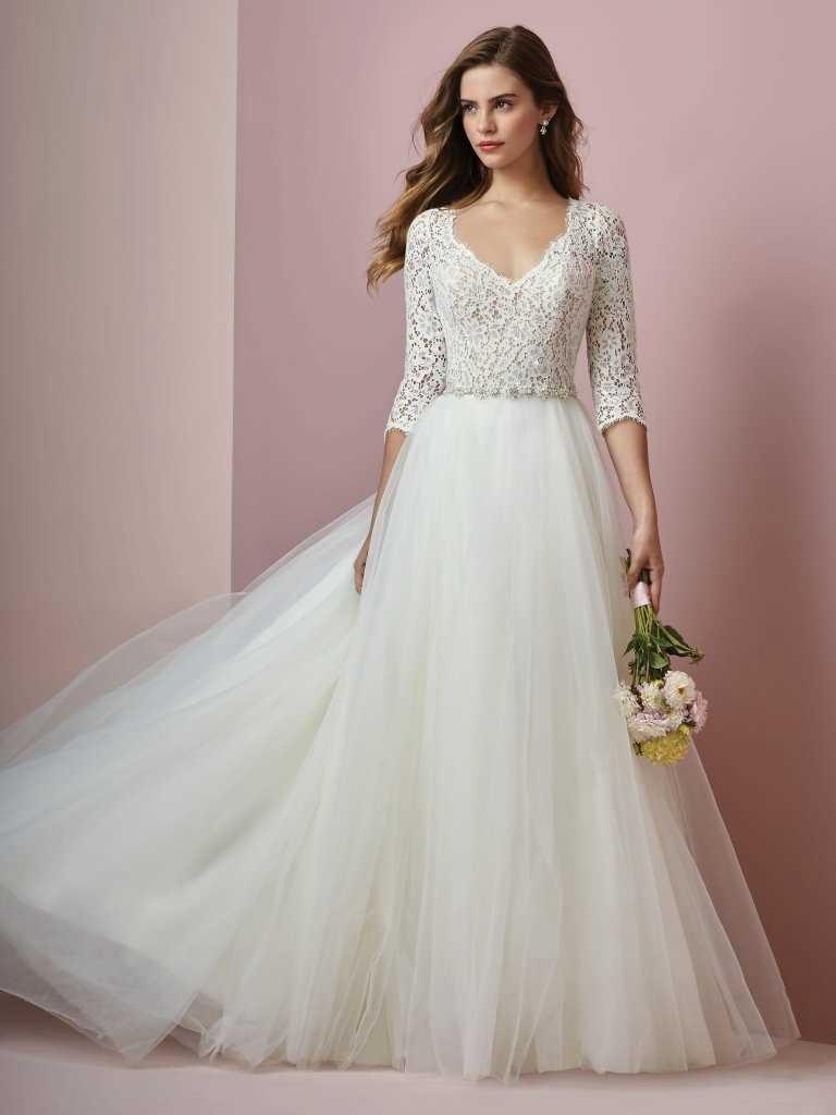 scarlett Published October 3, 2022 at 768 × 1024 Rebecca Ingram Scarlett sz10 Allover lace bodice with three-quarter sleeves, a V-neckline and a keyhole back. Attached beaded belt completes the tulle ballgown skirt. Finished with pearl buttons