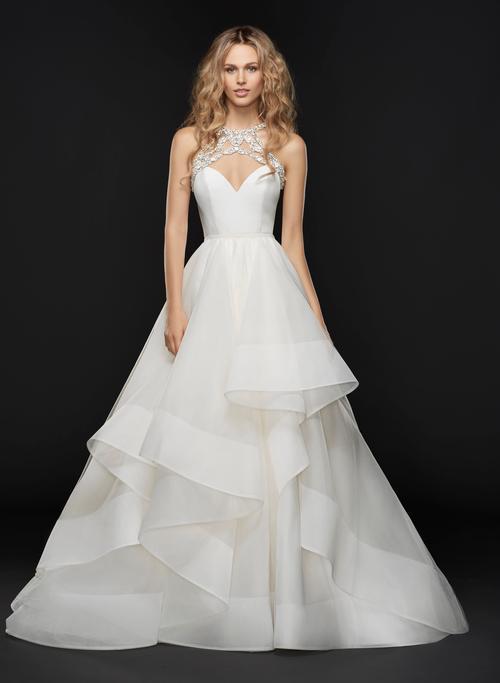 sloane Published August 28, 2021 at 500 × 683 Hayley Paige Sloane sz10 Silk crepe sweetheart bodice with jewel-neck moonstone and alabaster accent, open illusion back with beaded detail, fitted sheath gown beneath a full detachable skirt of layered tulle and organza.