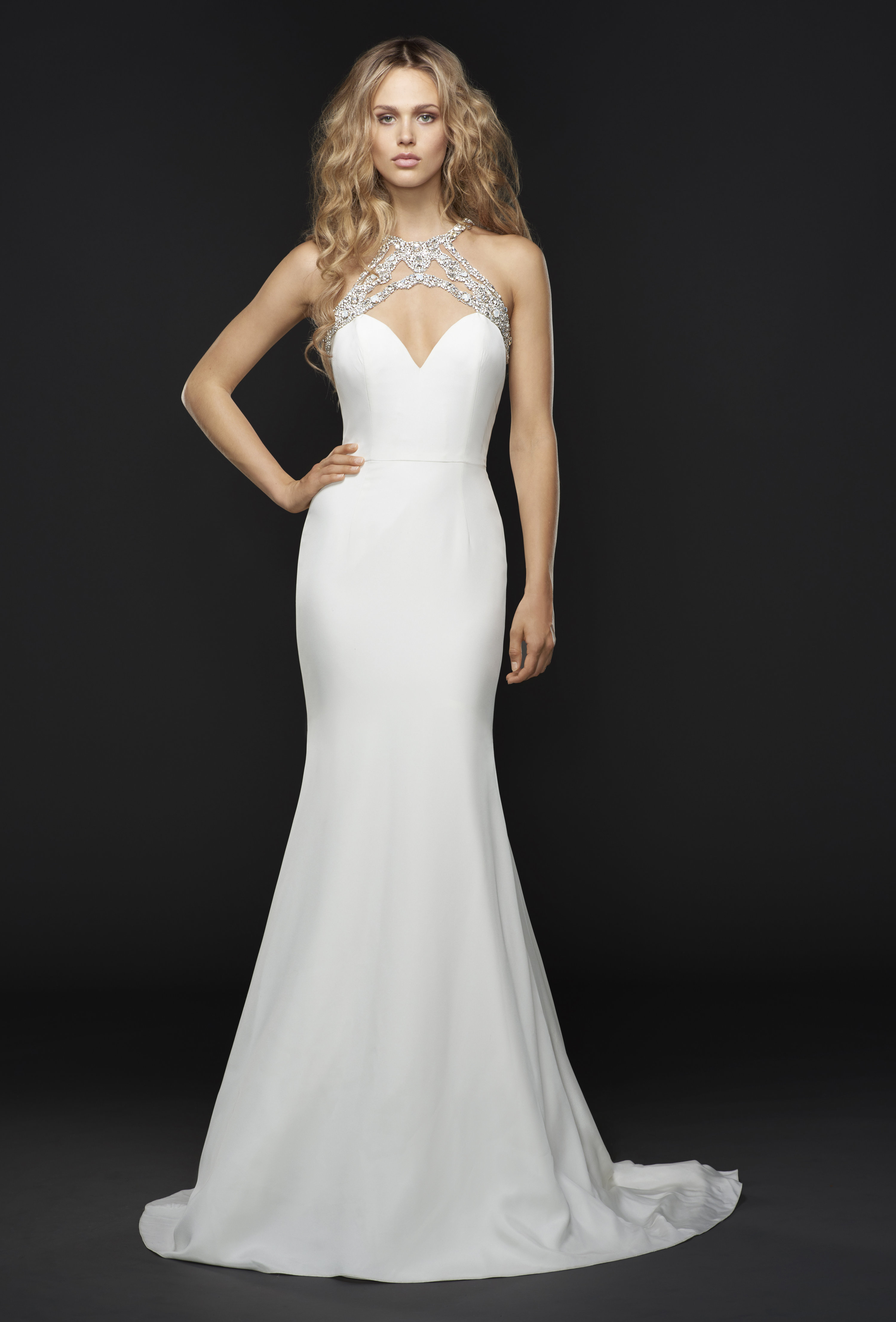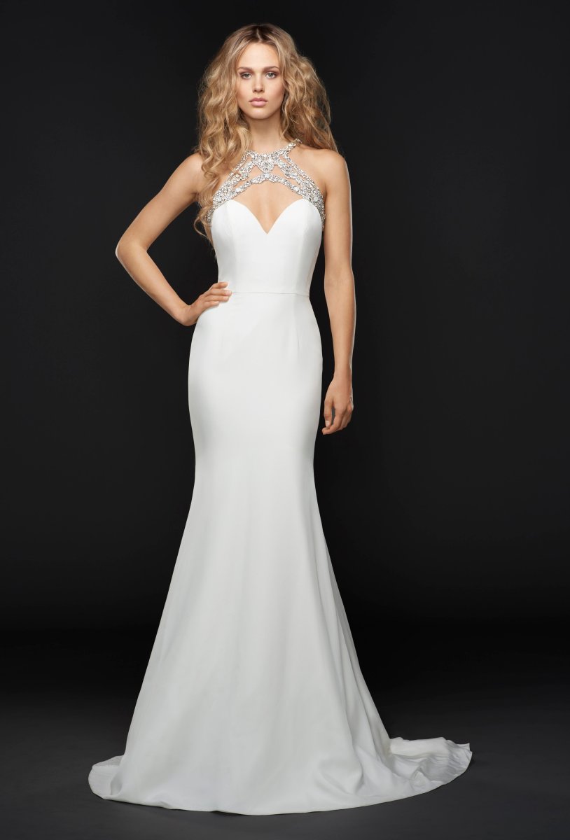 sloane Published August 28, 2021 at 3000 × 4425 Hayley Paige Sloane sz10 Silk crepe sweetheart bodice with jewel-neck moonstone and alabaster accent, open illusion back with beaded detail, fitted sheath gown beneath a full detachable skirt of layered tulle and organza.