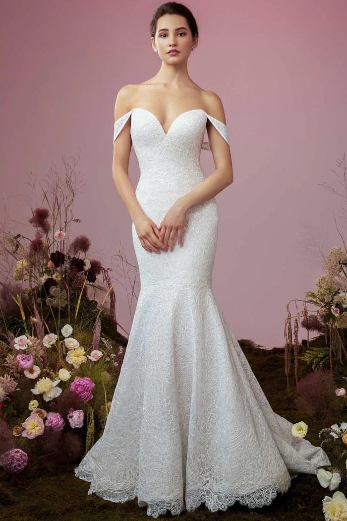 Soulmate Published July 16, 2025 at 700 × 1050 Anne Barge Soulmate sz14 A fitted gown of sequined embroidered lace, sweetheart neckline and detachable off-shoulder straps. Intricate 3D floral embroidery dances across the bodice. Adorned with floral appliqués bringing Couture-level craftsmanship.