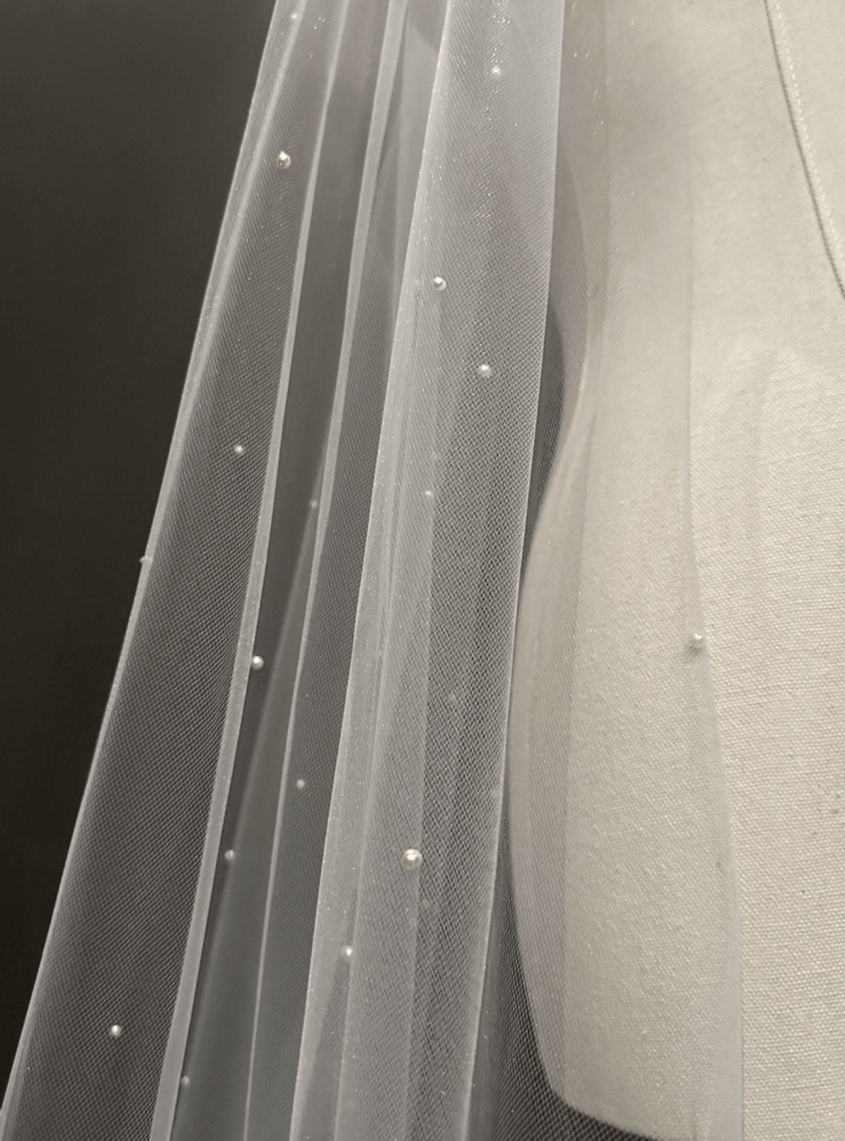 stacy Published July 14, 2025 at 948 × 1280 Sara Gabriel Stacy 47″ veil. Swarovski pearls are lovingly hand-scattered throughout. Veil has a cut edge
