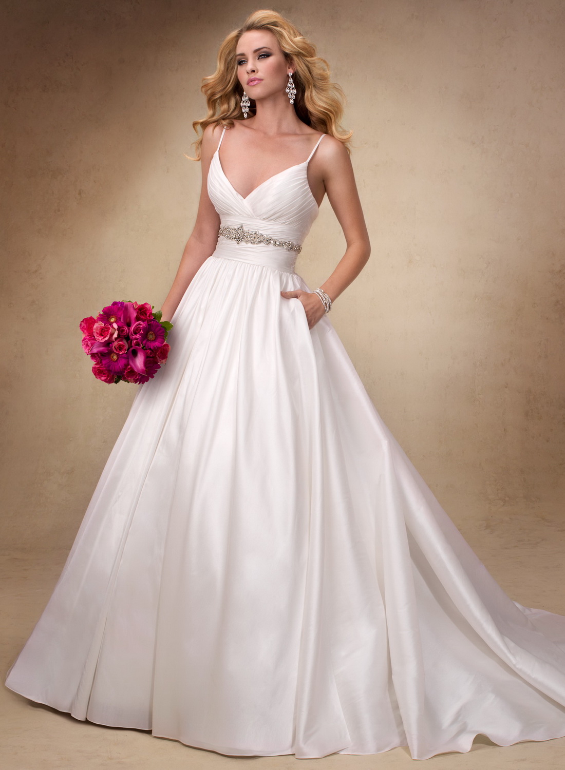 stephanie Published July 11, 2017 at 1100 × 1500 Maggie Sottero Stephanie sz12 V-neckline with delicate straps and fitted bodice. Crystals and beading at waistband. Full A-line skirt with chapel-length train. Pockets!