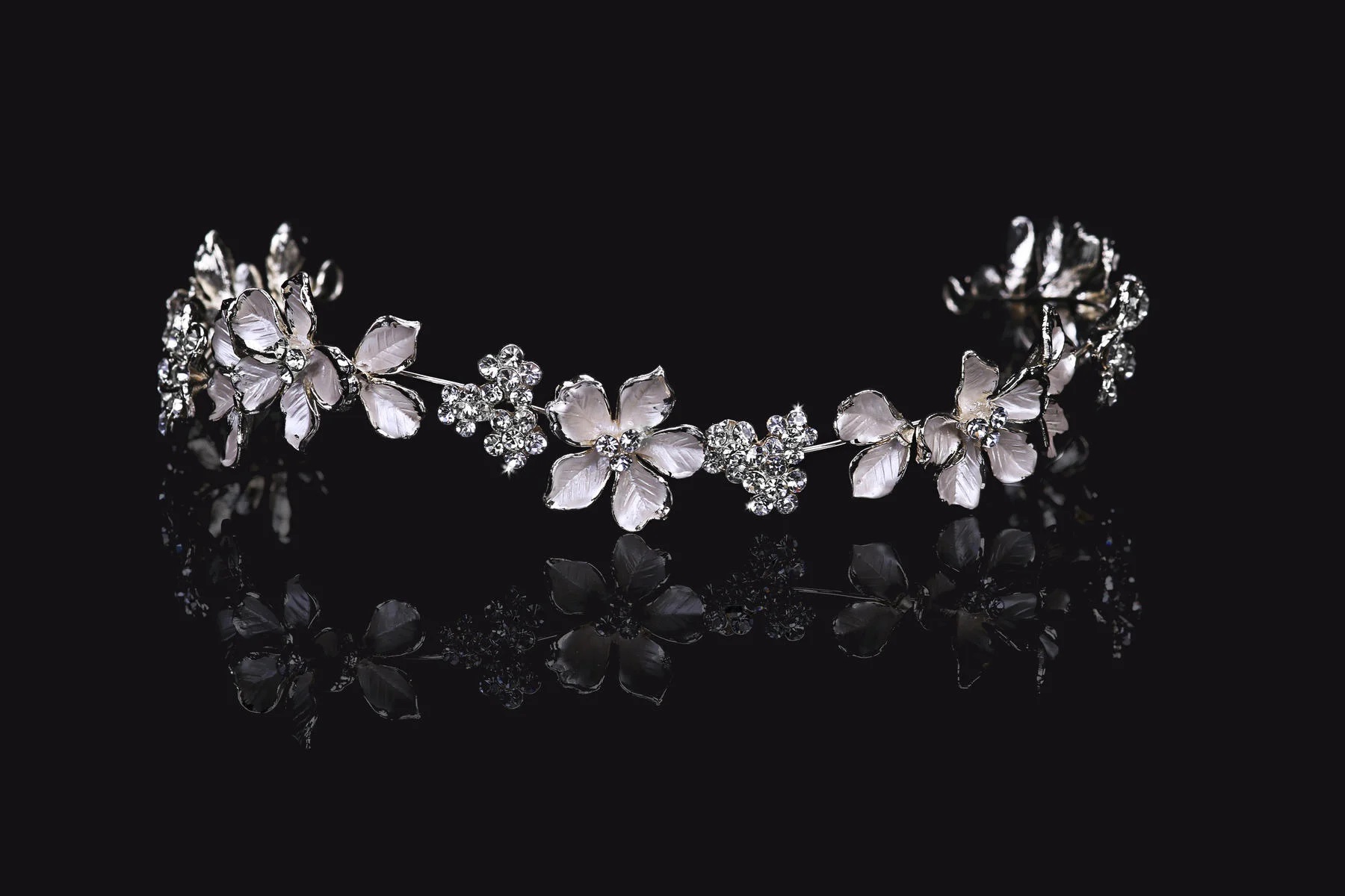 Rhodium plated rhinestone tiara with floral accents