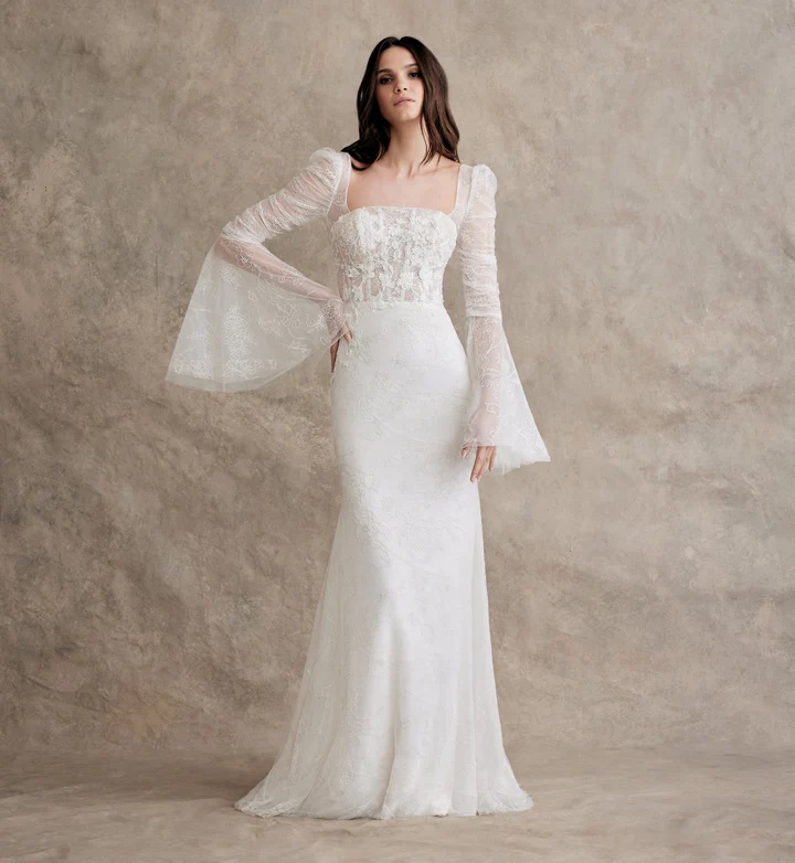 taya Published September 1, 2023 at 720 × 782 Francesca Avila Taya sz24 Ivory/silver Chantilly lace over net. Crescent illusion strapless bodice with embroidered appliqué detail and flattering fit. Available with detachable illusion draped bell sleeves.