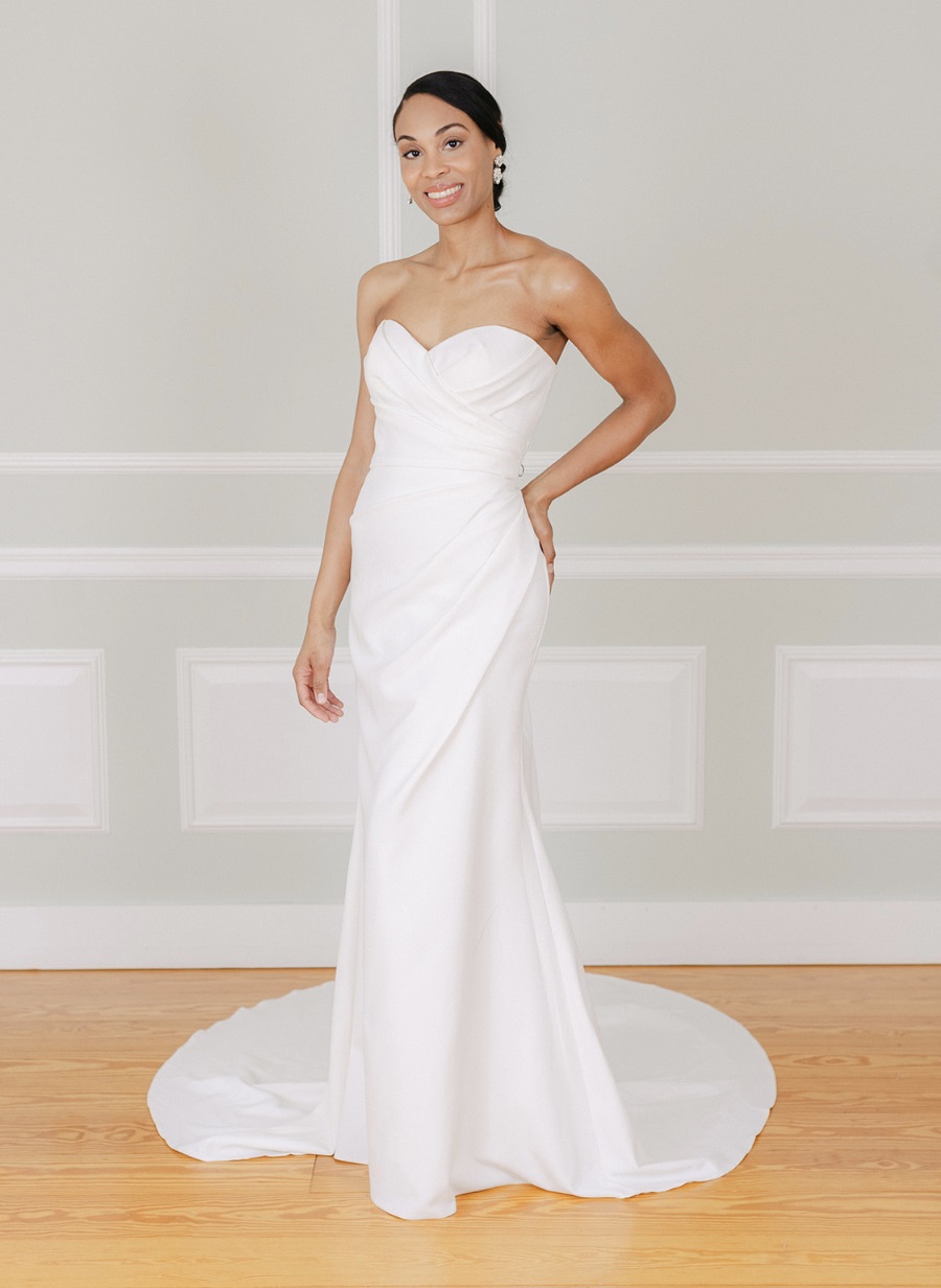TWD 21 Published December 19, 2024 at 900 × 1232 TWD21 sz12 Fitted crepe gown with flattering draped rouching and button back.