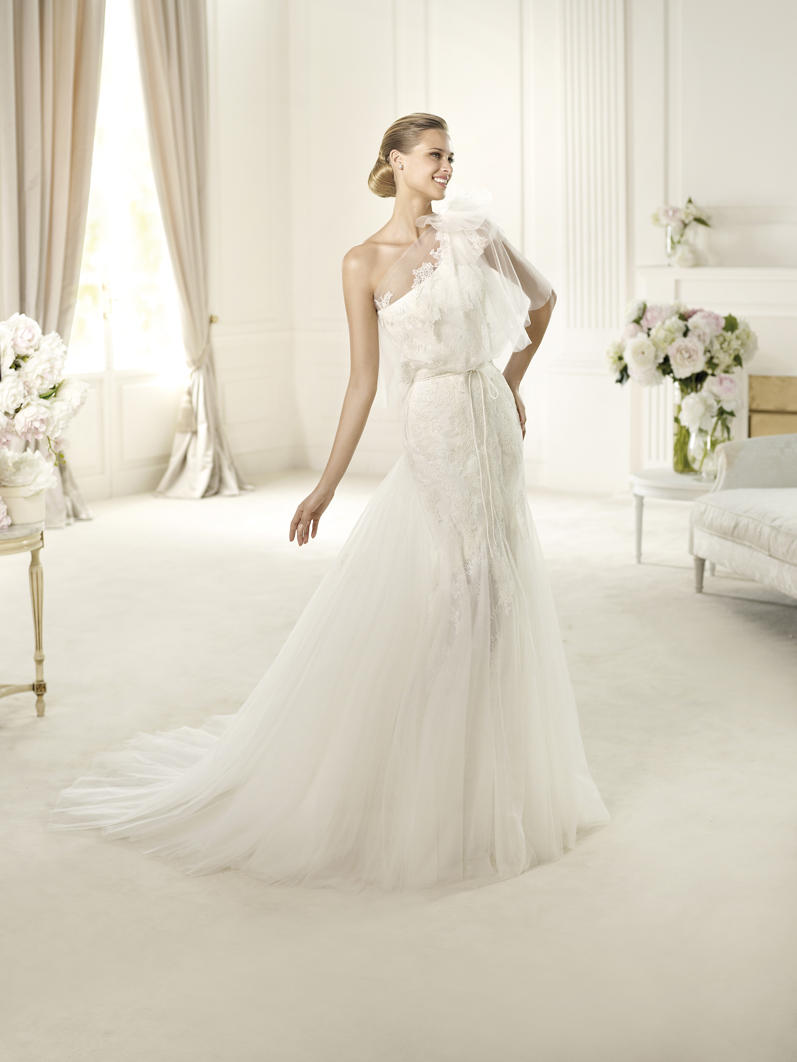 Ursino Published May 30, 2016 at 797 × 1062 Pronovias Ursino sz12 One shoulder fit and flare lace gown with rebrode lace and overlay net gown