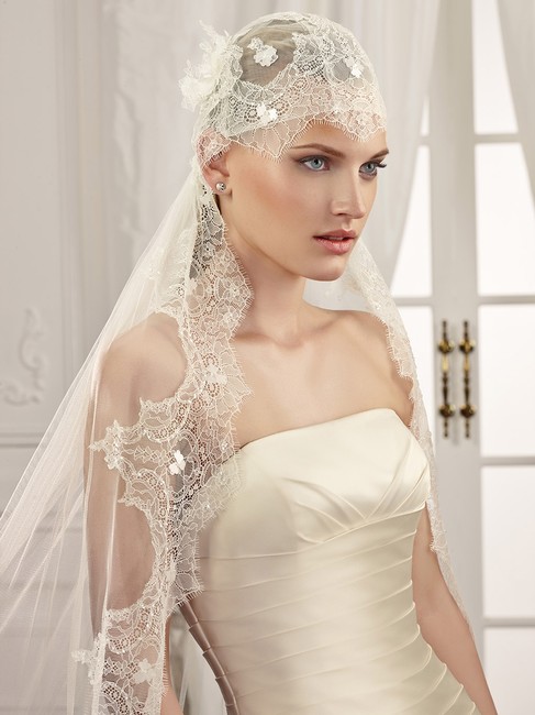 V2789 Published August 20, 2022 at 487 × 650 Pronovias V2789 Fingertip cap veil with Chantilly lace and floral appliques.