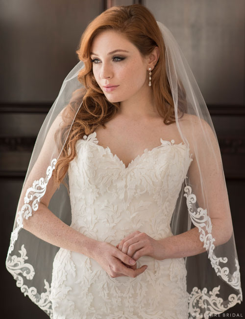 V7357 Published November 3, 2022 at 500 × 650 V7357 1-tier fingertip veil features gorgeous swirls inspired by Baroque designs and sparkling rhinestone accents