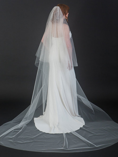 V7444C Published November 3, 2022 at 500 × 667 V7444c 2-tier fold-over cathedral veil glitters with a starburst design of multi-size Swarovski rhinestones. Clustered at the top and fanning out like fallen stars at the bottom