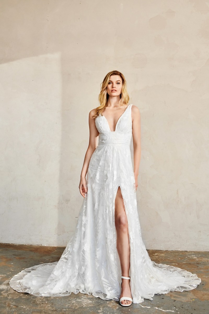 winnie Published July 1, 2025 at 1365 × 2048 Kelly Faetanini Winnie sz10 Floral embroidered V-neck gown drapes into a stunning A-line skirt with slit