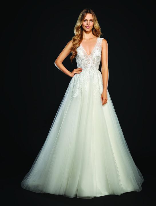 winnie Published December 12, 2020 at 545 × 720 Hayley Paige Winnie sz10 Tulle ball gown, draped V-neck bodice with lace applique, keyhole back with ribbon cut out detail.