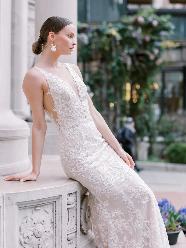 winston Published November 18, 2025 at 750 × 1000 Beccar Couture Winston sz10 Beaded all over lace fitted gown with a low v plunge neck. Low back.