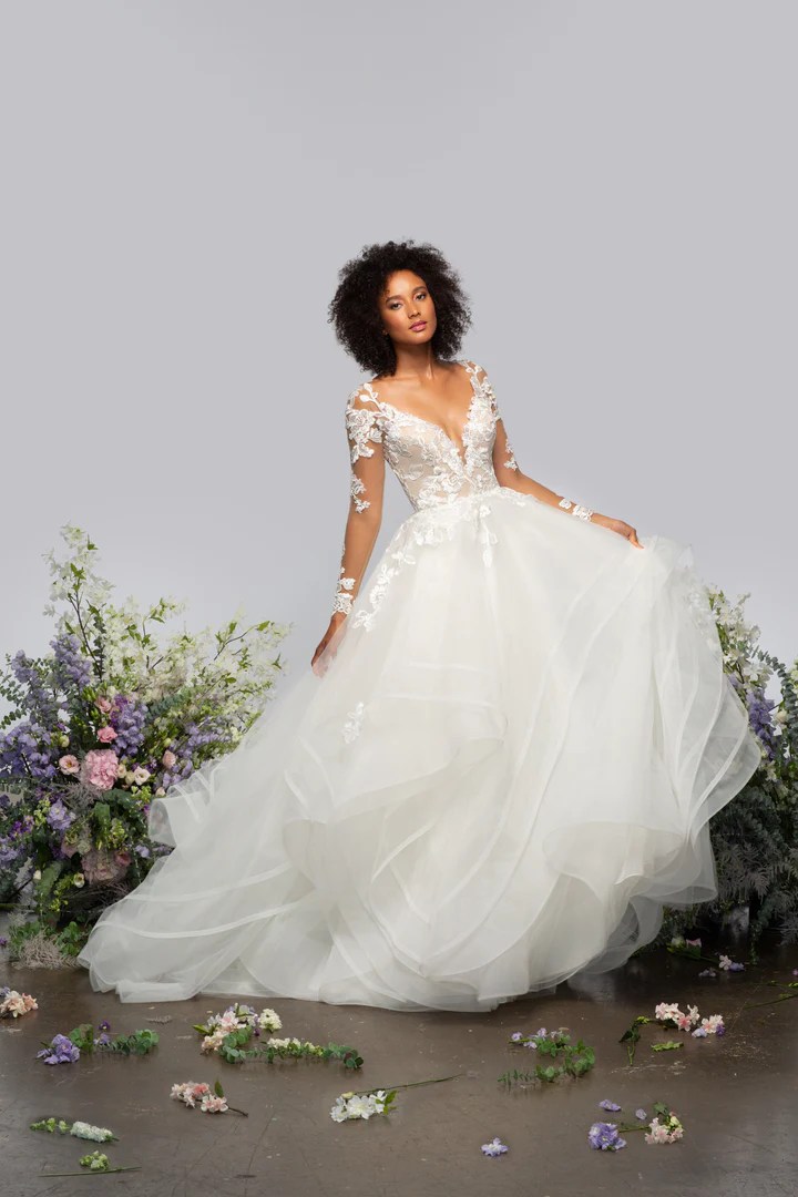 wrigley Published May 27, 2023 at 720 × 1080 Hayley Paige Wrigley sz14 Embroidered lace and tulle ball gown, illusion long sleeve bodice with curved V-neckline and full illusion back, floral embroidered lace over cashmere lining, cascading tulle skirt with thin horsehair trim. Matching veil available